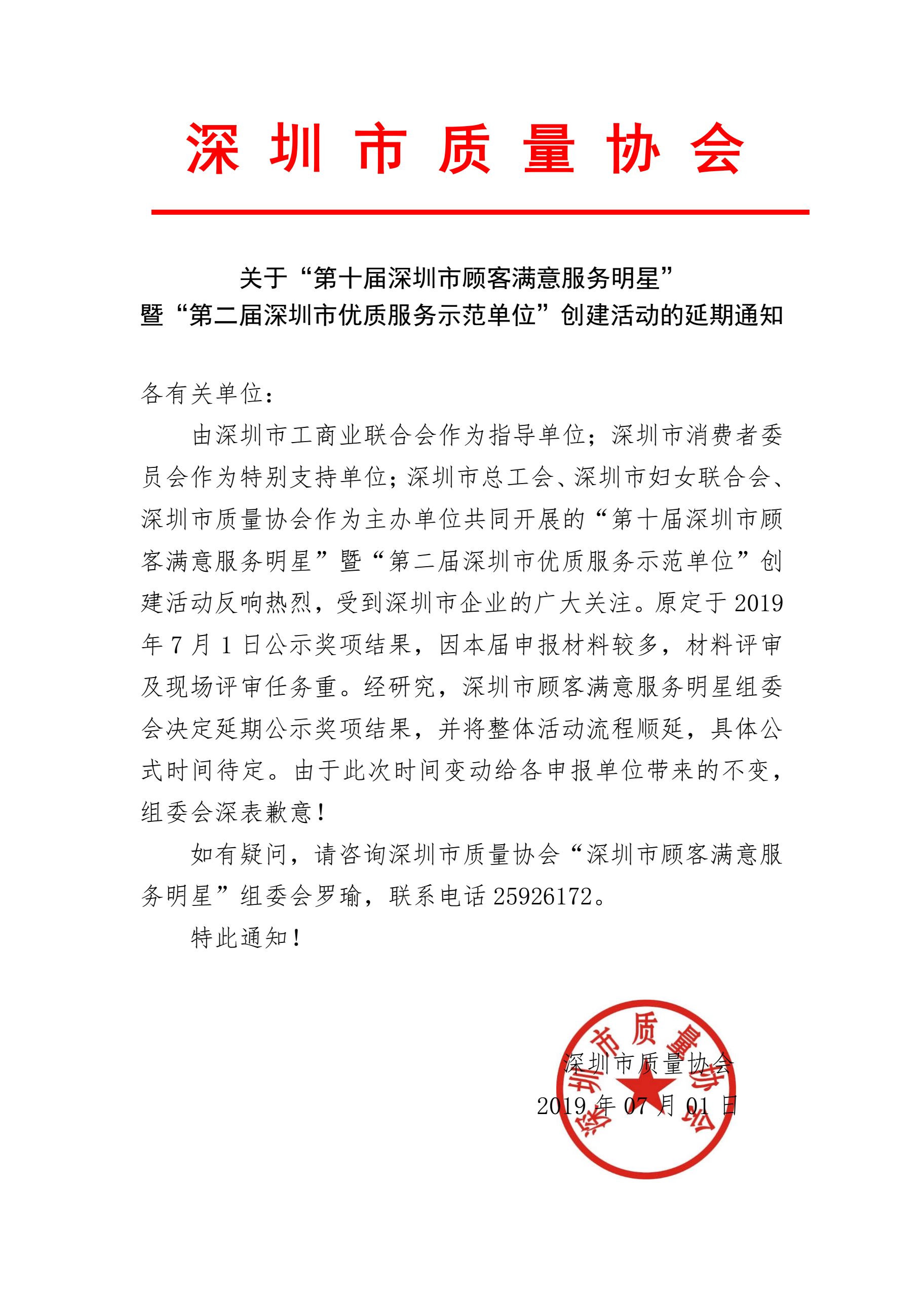 深圳新闻网讯 7月1日,深圳市质量协会下发延期通知,通知显示原定于2019年7月1日公示奖项结果,因本届申报材料较多,材料评审及现场评审任务重。经研究,深圳市顾客满意服务明星组委会决定延期“第十届深圳市顾客满意服务明星”暨“第二届深圳市优质服务示范单位”创建活动公示奖项结果,并将整体活动流程顺延,具体公式时间待定。由于此次时间变动给各申报单位带来的不变,组委会深表歉意!