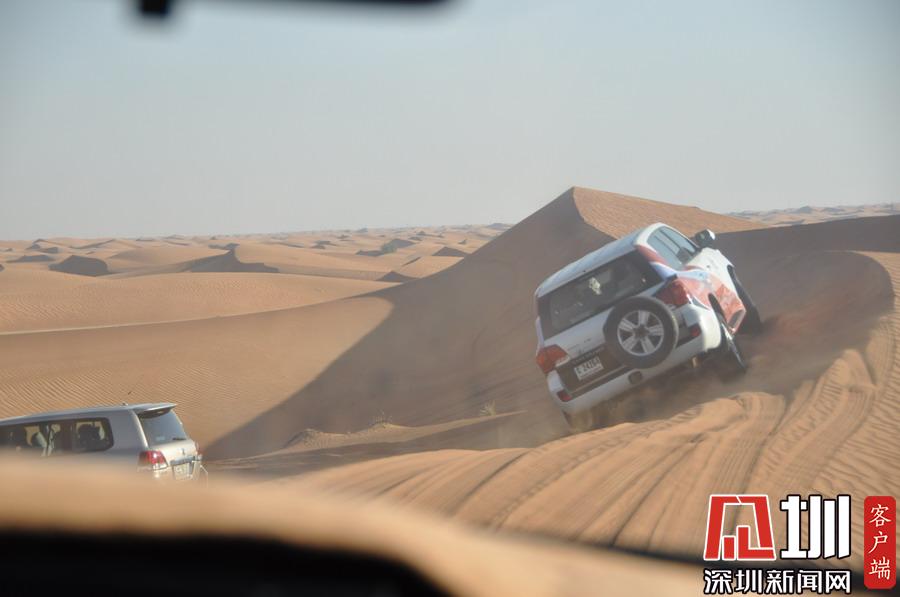 去迪拜,一个最不可错过的体验项目就是"冲沙"。所谓冲沙,就是高速的车在沙丘里不断爬坡、俯冲、腾飞、落下等等一系列惊险的动作。李仁奇摄