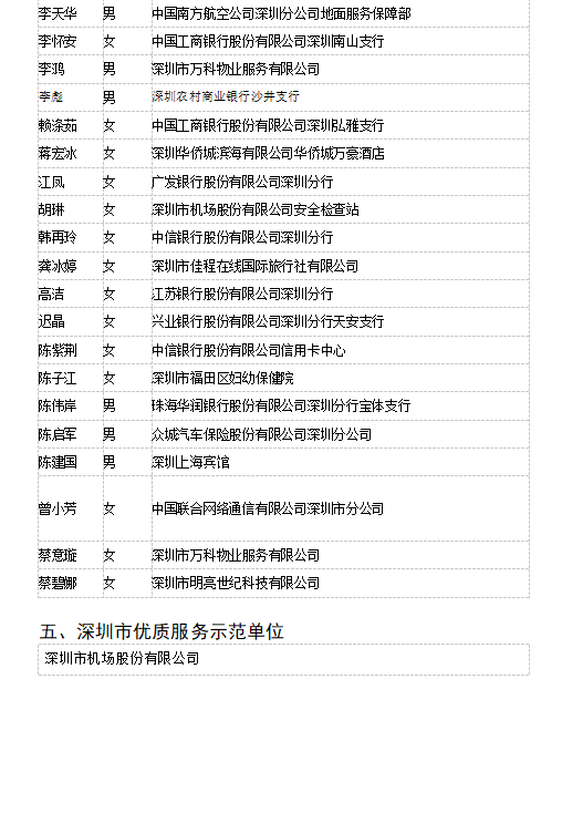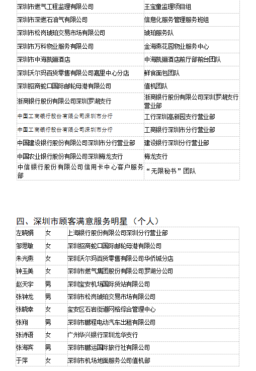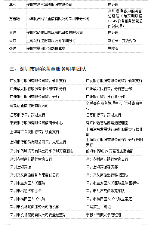 据了解,“第十届深圳市顾客满意服务明星”暨“第二届深圳市优质服务示范单位”创建活动经过层层选拔推荐、材料评审、现场评审,有18家单位拟推荐为“第十届深圳市顾客满意服务明星单位”,陈繁华等10位管理者为“第十届深圳市顾客满意服务明星杰出管理者”,30个团队为“第十届深圳市顾客满意服务明星团队”,左晓娟等60位从业人员为“第十届深圳市顾客满意服务明星(个人)”,深圳机场股份有限公司为“第二届深圳市优质服务示范单位”。