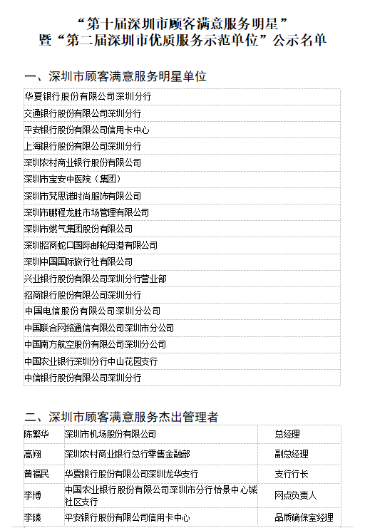 深圳新闻网2019年8月16日讯 8月16日,深圳市质量协会正式下发“第十届深圳市顾客满意服务明星”暨“第二届深圳市优质服务示范单位”拟推荐名单正式对外公布并进行公示,公示时间为2019年8月16日至2019年8月21日。