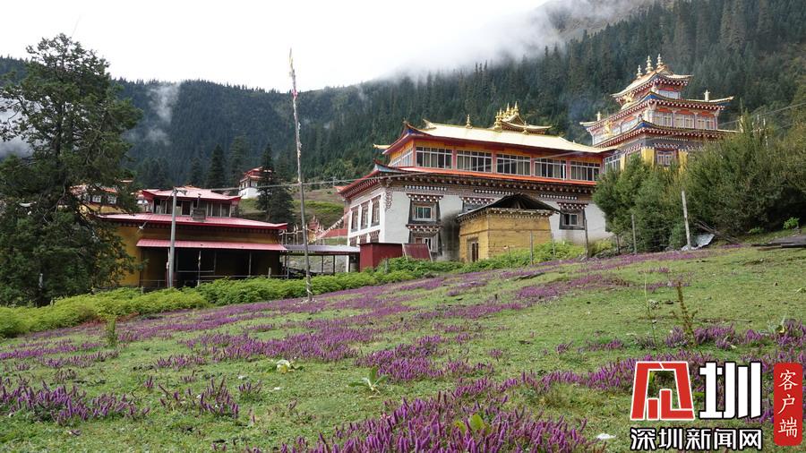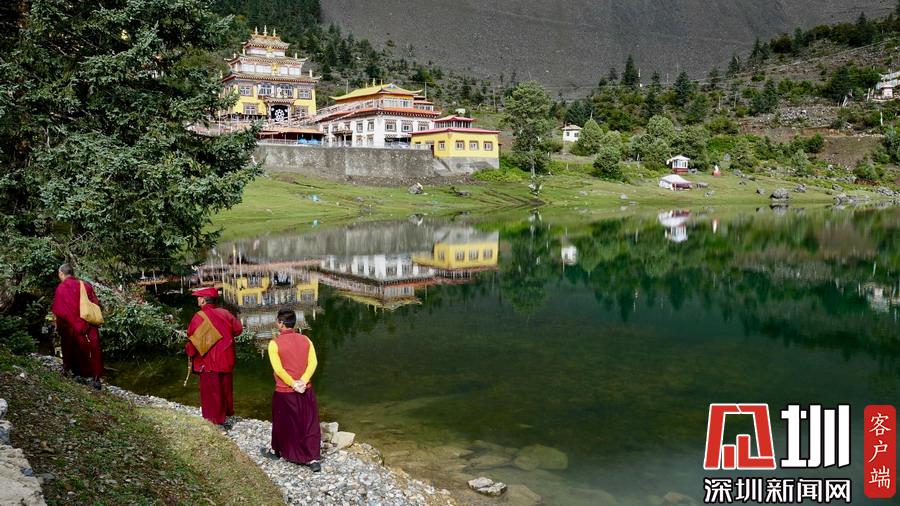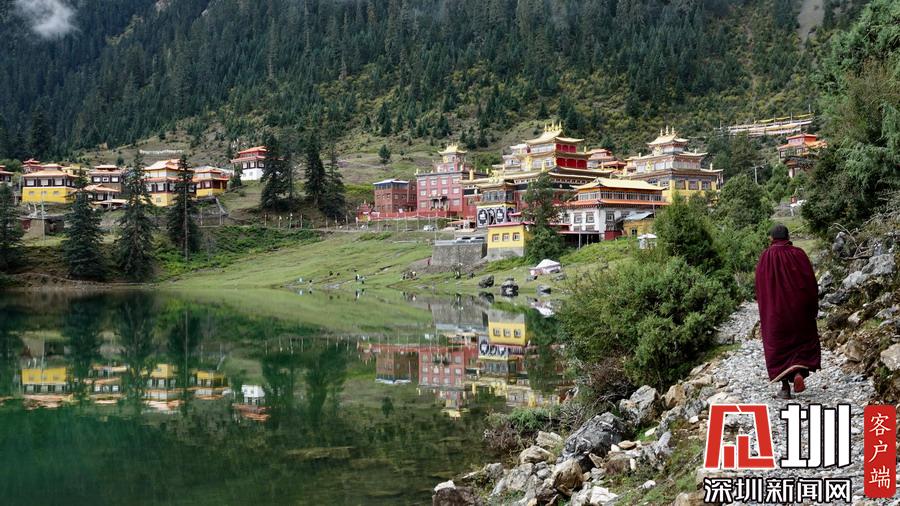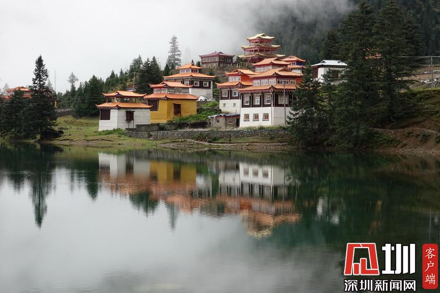 湖的四周是森林和由措卡寺寺僧主持修建的藏传佛教各色建筑,它们时而云遮雾障,时而与蓝天白云一起倒映在湖中。李仁奇摄