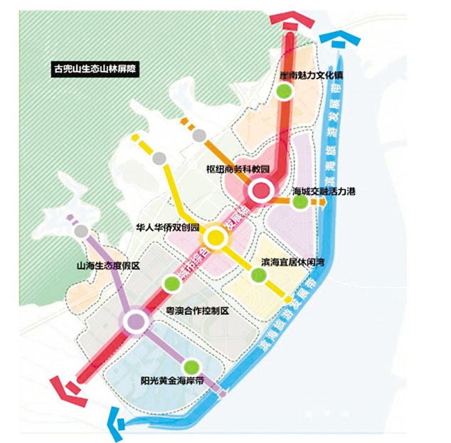 综合服务,重点发展创新创业平台、教育医疗、娱乐休闲、生活居住等城市综合服务产业,为港澳地区、周边地区提供综合就业生活功能。其中,正在加速建设的碧海银湖项目总体量约占地3500亩。