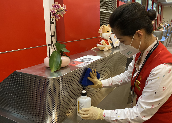 深航地面服务部高端值机环节工作人员,每日上岗接班前,对所有柜台进行消毒杀菌,确保旅客放置物品、衣物接触的地方安全放心。