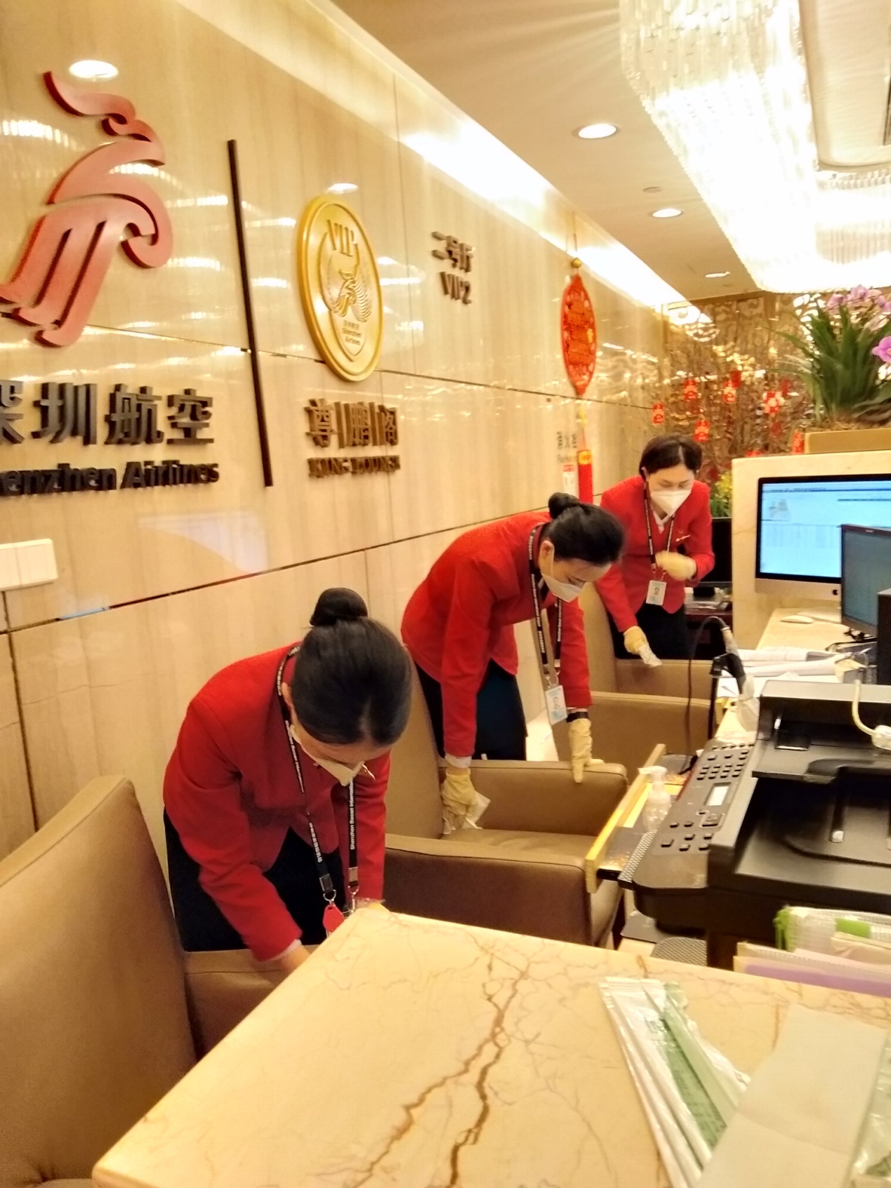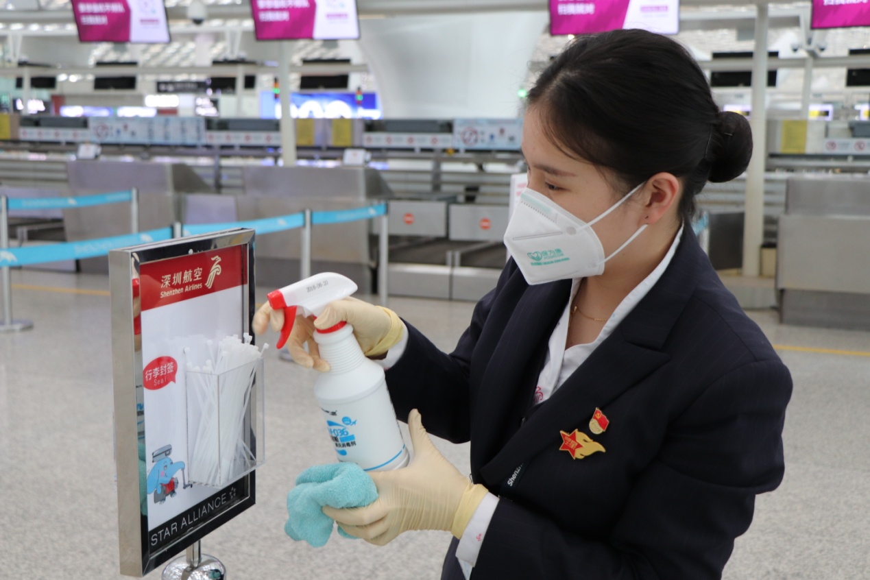 深航地面服务部及时对旅客可接触到的地方进行消毒,有效清洁是看得见的安全。