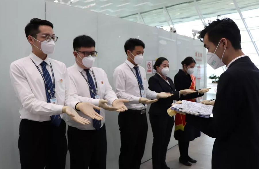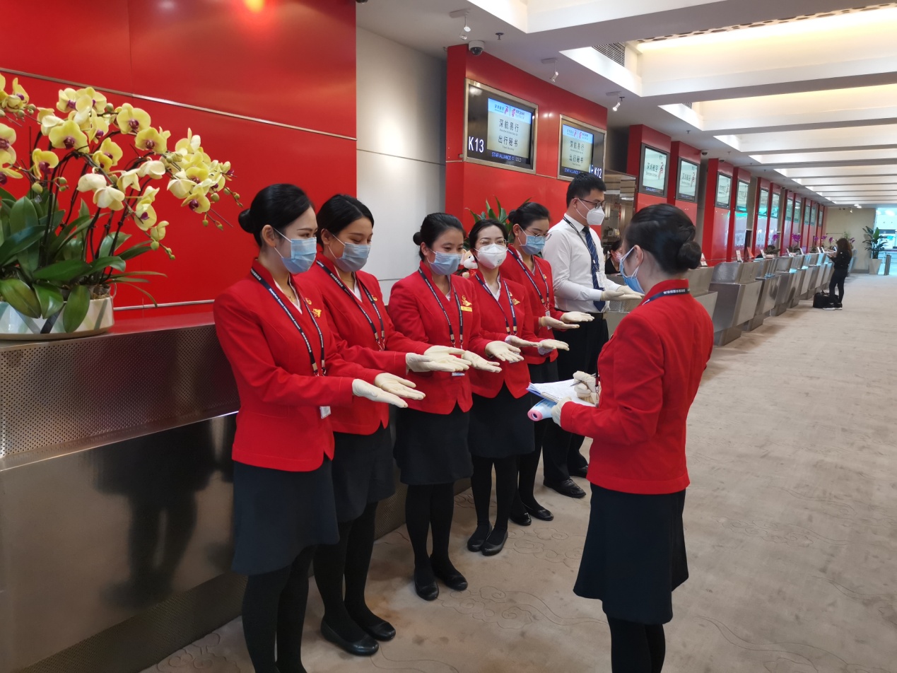 岗前检查。深航地面服务部值机环节强调柜台纪律,对上岗员工进行检查,防护你我,我们认真做。