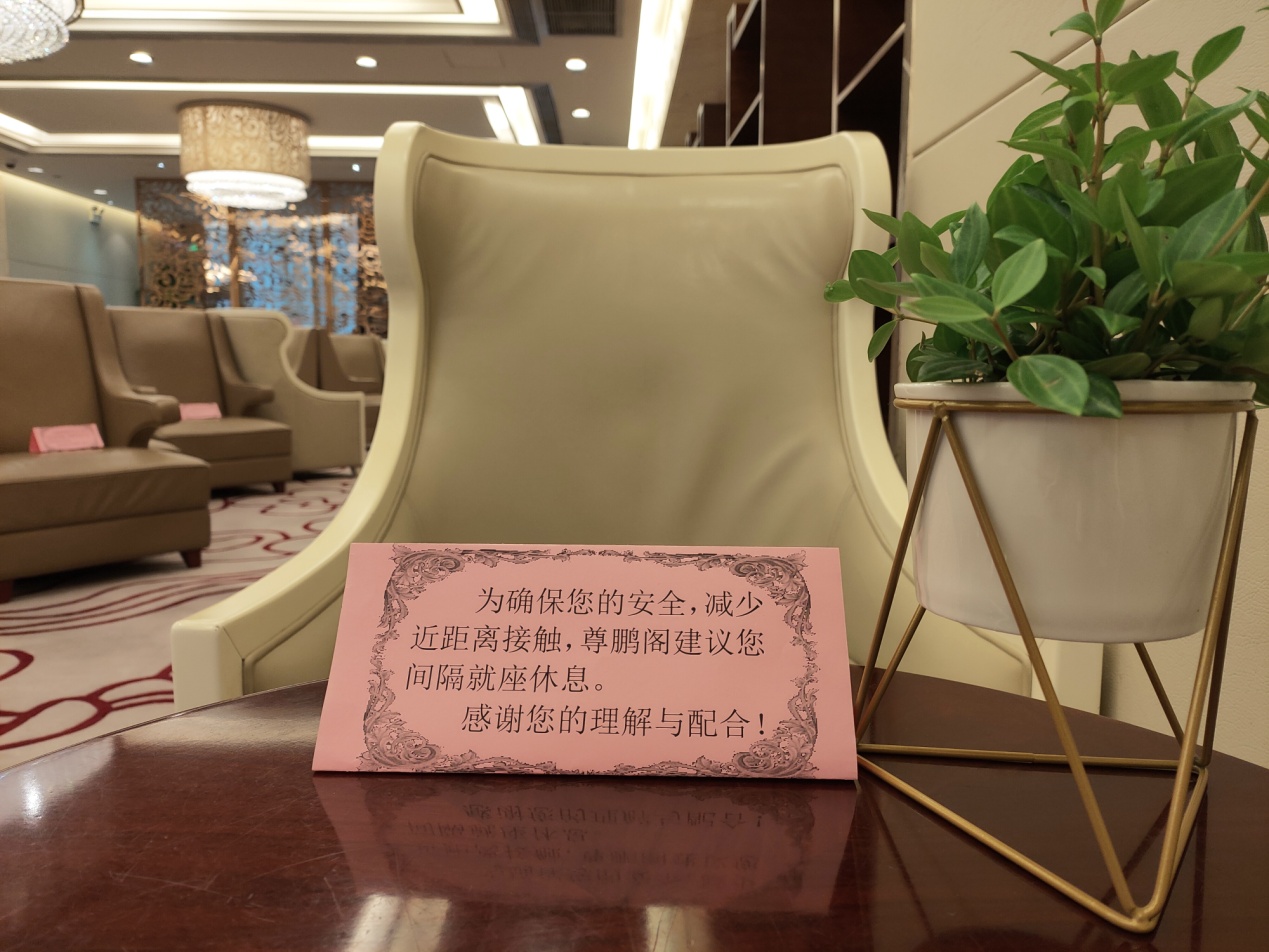 隔位就坐,距离产生美。深航地面服务部贵宾休息区域提供温馨提示牌,间隔对座放置,为旅客提供安全休息空间。