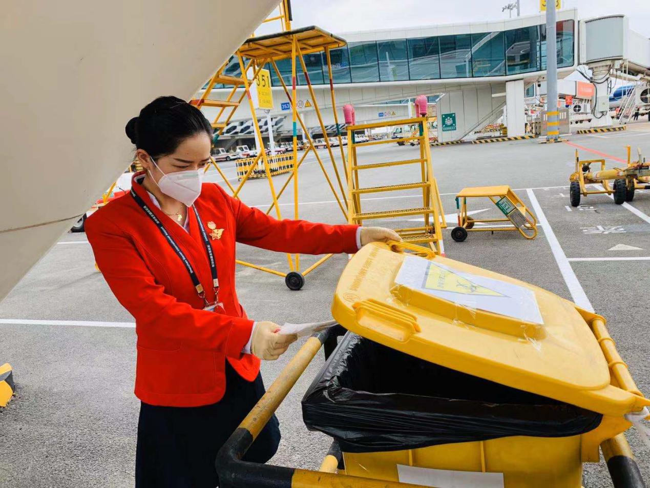 防疫用品,专人定点回收。深航地面服务部贵宾服务环节对于废弃防疫物品,及时回收并密封装袋,立即清理,为旅客提供安心休息环境。
