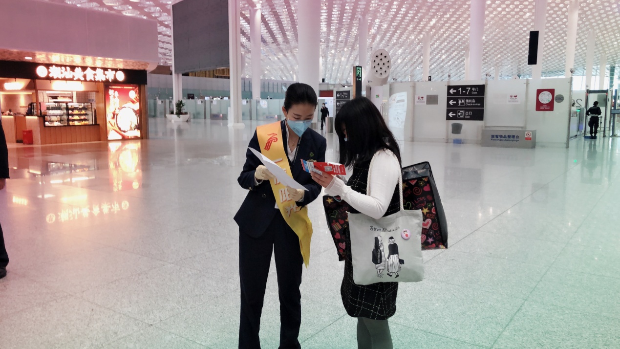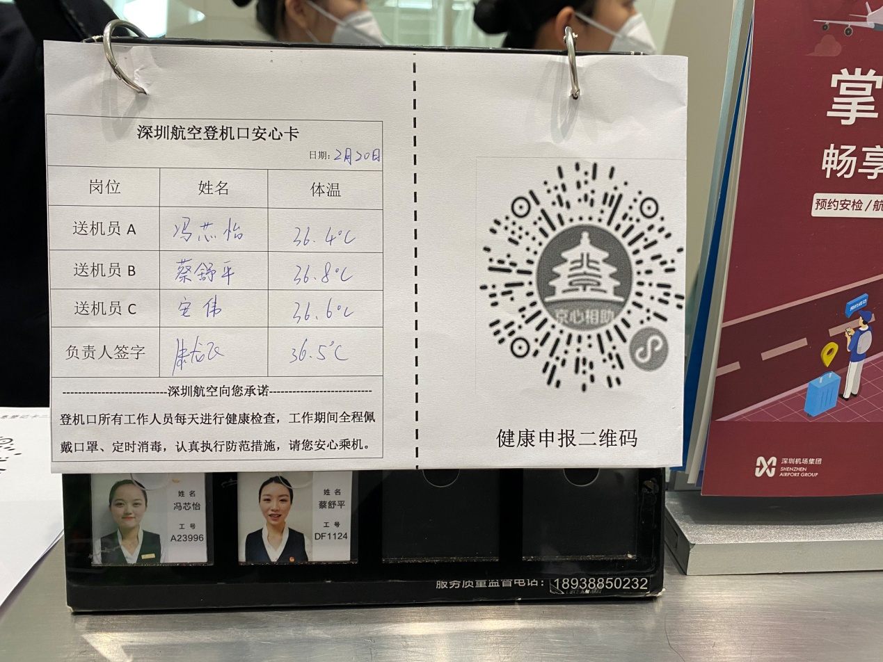 为了做好对客服务工作,保障旅客复工复产路上的出行安全,深航地面服务部登机环节推出“安心卡”服务,如实记录工作人员体温,供旅客监督查阅。
