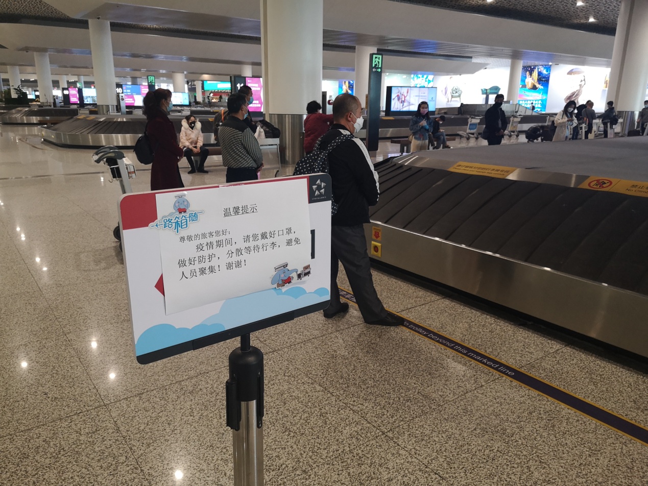 贴心提示,分散等待行李。深航地面服务部行李环节针对疫情,制作温馨提示贴,播放小广播,积极分散旅客,避免聚集等待行李。