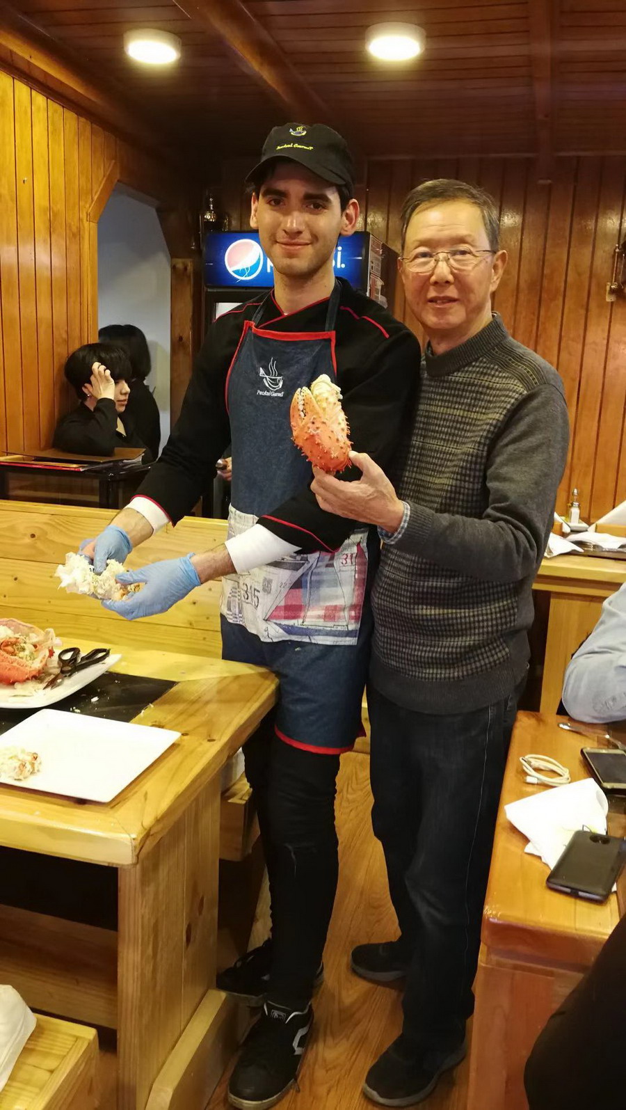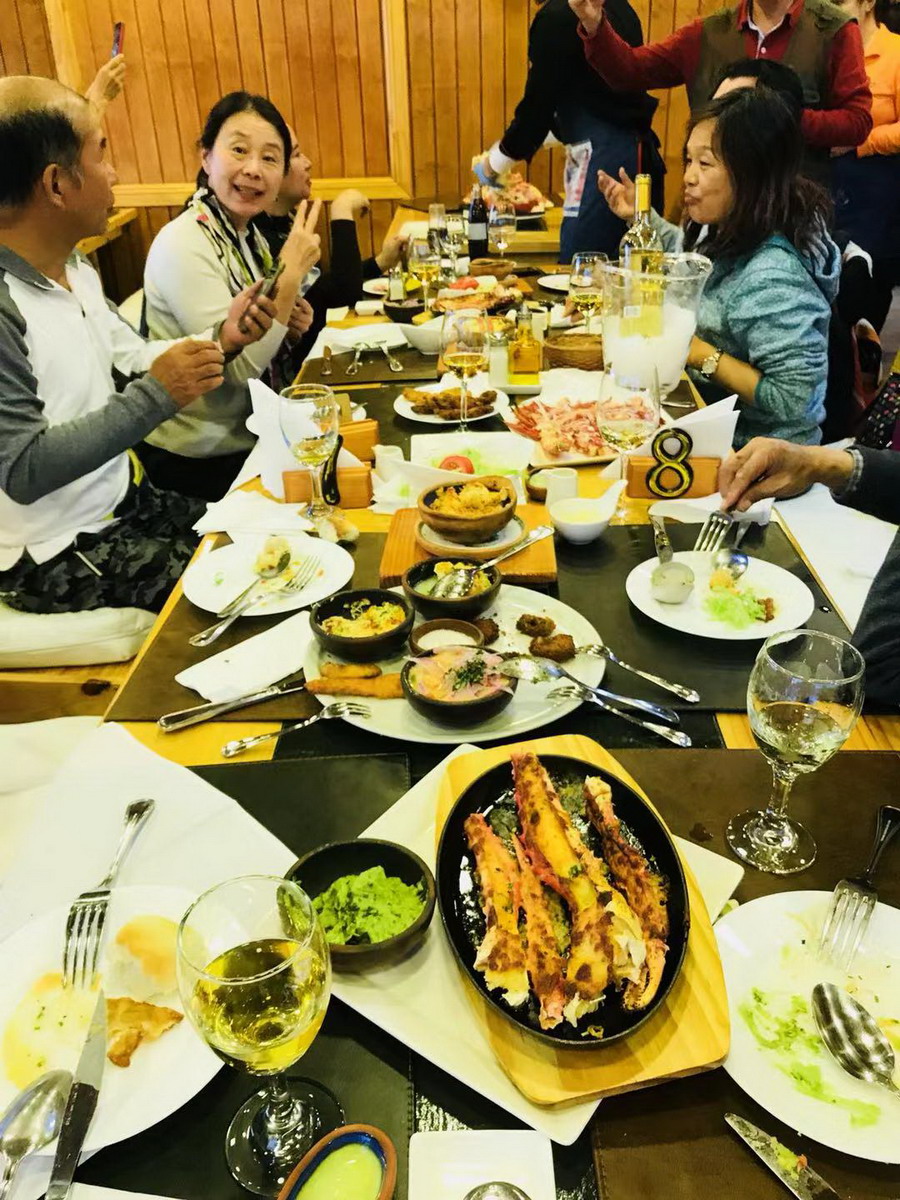 网友们选了一只5公斤多的活蟹,连同其他海鲜和两瓶酒,9个人消费了14750比索,合人民币1500元左右,这个价格远低于阿拉斯加,只是国内消费蜘蛛蟹价格的不足一成。李仁奇摄