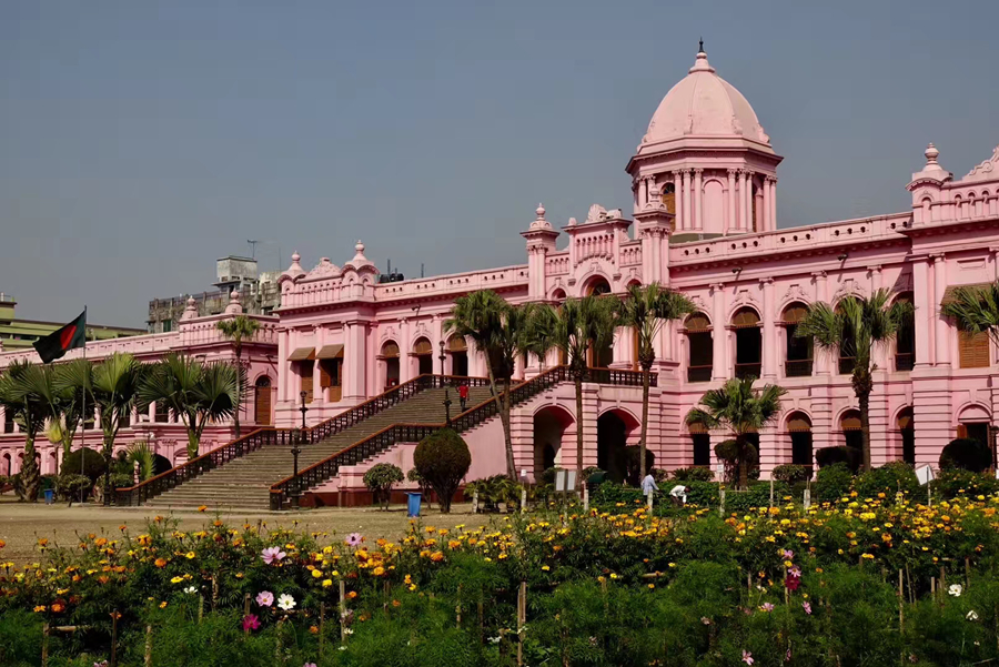 距孟加拉恒河渡口不远的地方有一座粉红色宫殿式的豪华建筑。那是1872年一位名叫阿赫桑曼济勒的地主在法国人留下的仓房基础上改建的私邸,后来曾在一次龙卷风袭击时受创。李仁奇 摄