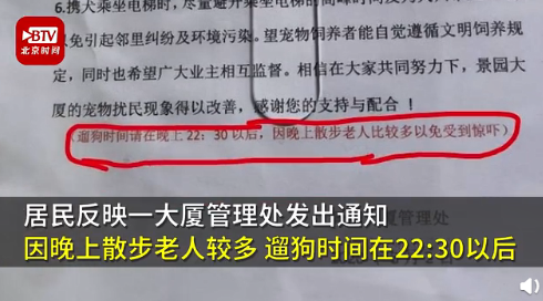 见圳客户端•深圳新闻网2020年8月11日讯(记者 战旗)近日,深圳一网友在网络平台发布消息,称其租住的房间所在大厦管理处发布一则“十点半后才能遛狗”的通知。对于此通知,该网友认为自己遛狗牵绳、犬只出门戴嘴套、相关证件齐全,管理处没有权利限制居民遛狗时间。管理处相关人员则回应称,发布这样的通知是因为居住在此大厦的老人较多,并且接到过多次投诉,表示该通知只是提出建议。