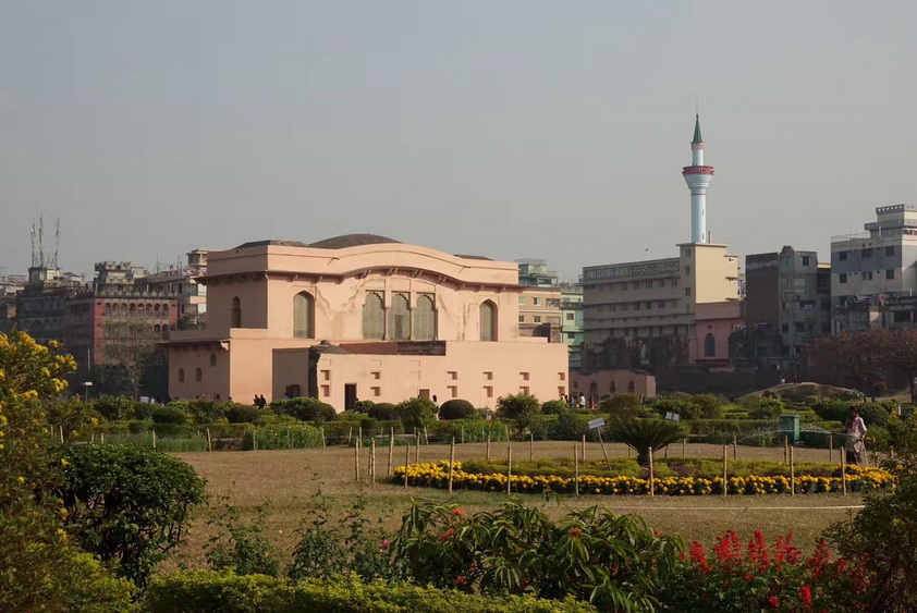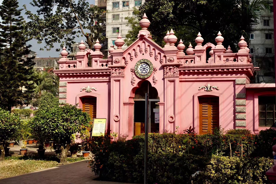 距孟加拉恒河渡口不远的地方有一座粉红色宫殿式的豪华建筑。那是1872年一位名叫阿赫桑曼济勒的地主在法国人留下的仓房基础上改建的私邸,后来曾在一次龙卷风袭击时受创。李仁奇 摄