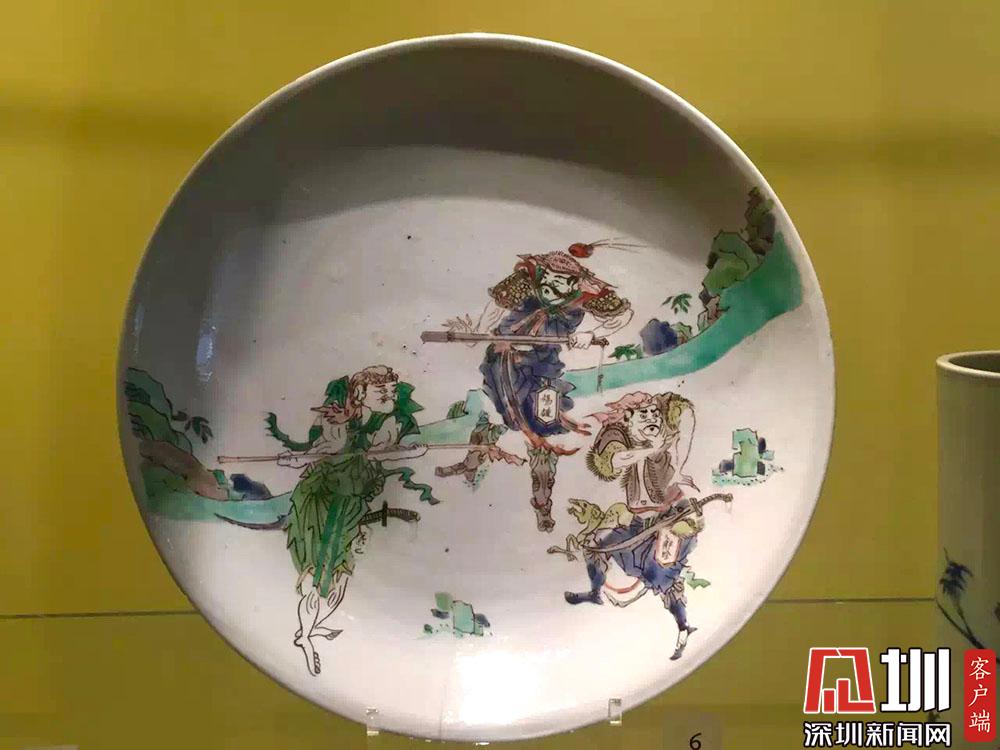 另一款水浒故事粉彩盘上,三个人物都有姓名,分别是:杨雄、解珍、阮小七。