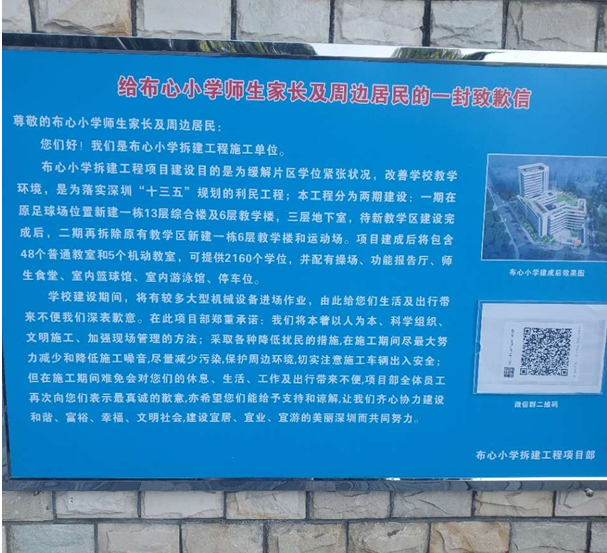 11月9日,有市民在深圳论坛发帖反映称,“小孩如今就读布心小学。可开学一个月后,就看到校内有公示说学校将会原地重建。”该家长对学生的安全情况表示担忧:“这几年因地下结构受影响而导致路面坍塌的情况时有发生,现如今要在与教室目测距离不超过五米的地方建两座分别为13层和6层的建筑,这样大的工程量如果不分流,施工风险可想而知。即使重建采用高新技术,能够保证教室的安全,但学生又如何能在学校与工地的混合期里度过至少四年以上的工期?粉尘和噪音对学生的影响也很大也可想而知。”