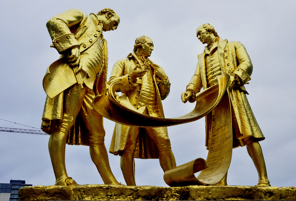 伯明翰是工业革命的发源地,市区会展中心对面有一座代表城市形象的雕塑作品,三个镏金人物的塑像并肩伫立,正在讨论问题,其金灿灿外表十分抢眼。这三个塑像是英国工业革命时期的杰出人物,蒸汽机的发明和制造者瓦特,蒸汽机和煤气街灯的发明者默克多,工业家和机械制造商马修·博尔顿。李仁奇 摄