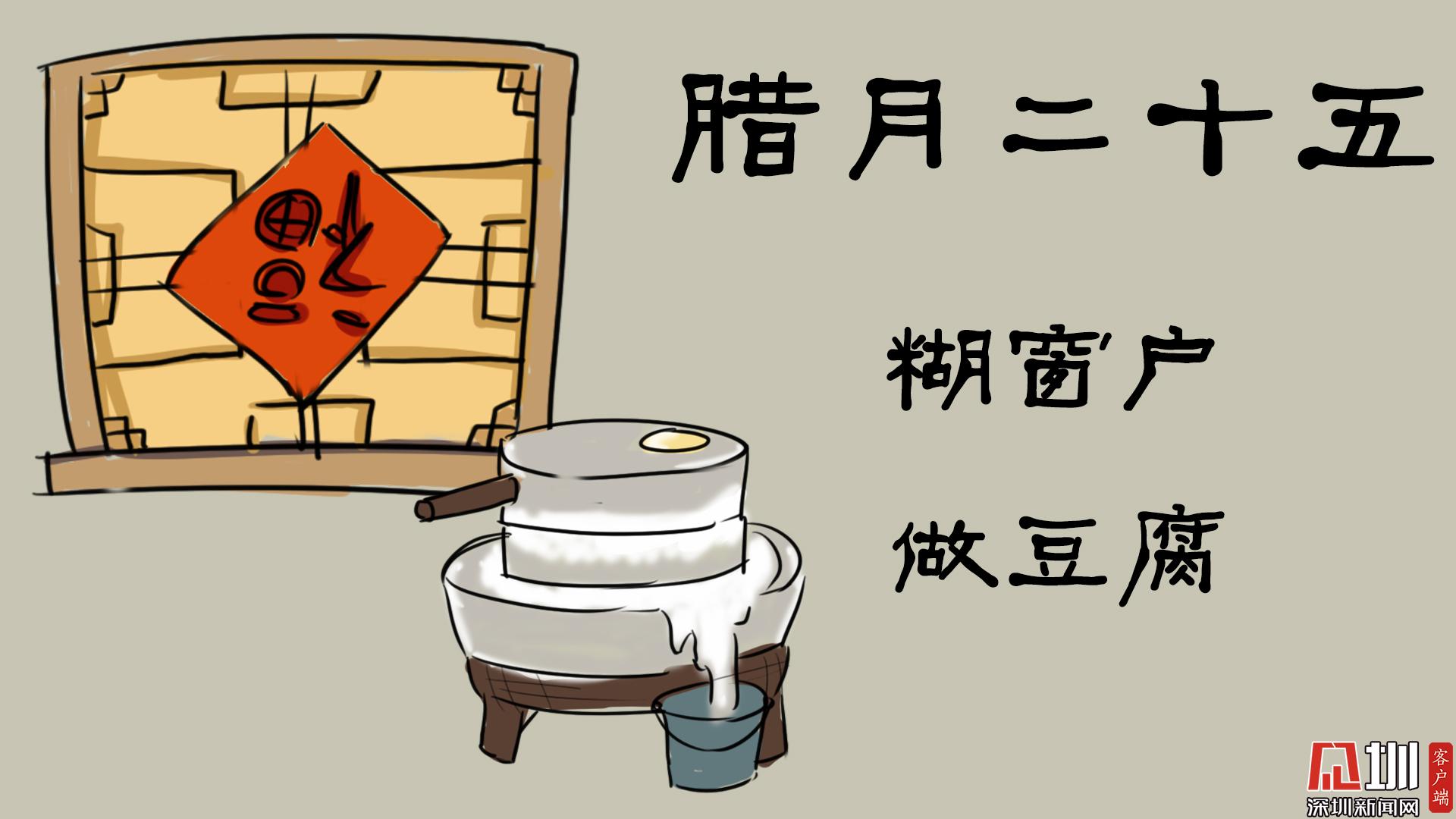 到了这天,人们将浸泡过的黄豆,用石磨磨碎,制作好春节要食用的豆腐。因为腐与富谐音,寓意着来年富富余余。腊月二十五还有“糊窗户”的说法,即二十四扫完尘、二十五就该糊窗户了。但随着社会发展,糊窗户的传统已渐渐失去,但贴窗花、贴福字、挂对联仍然是必不可少的。