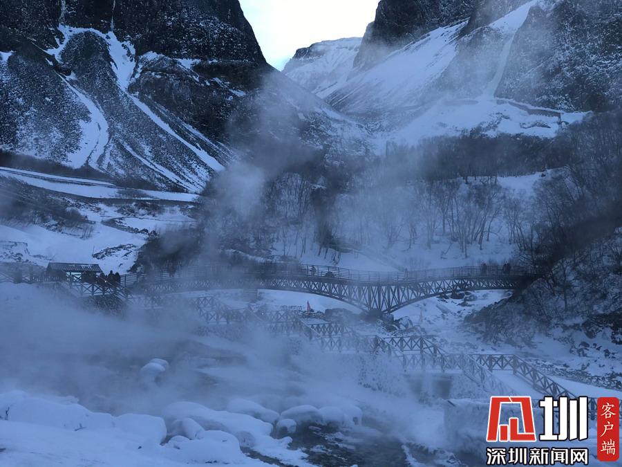 温泉热气蒸腾,烟雾缭绕,在其中行走仿佛在仙境中游览。
