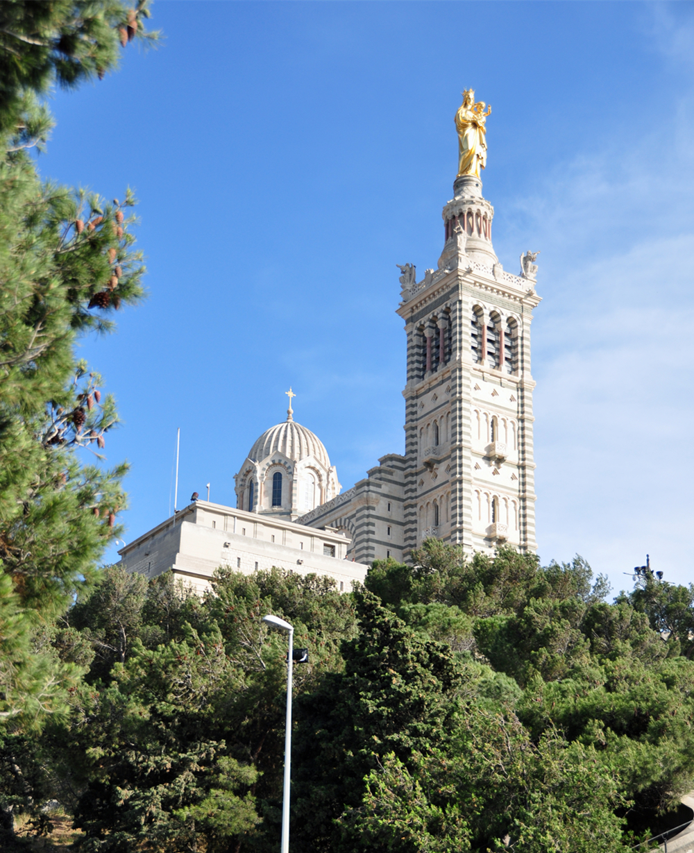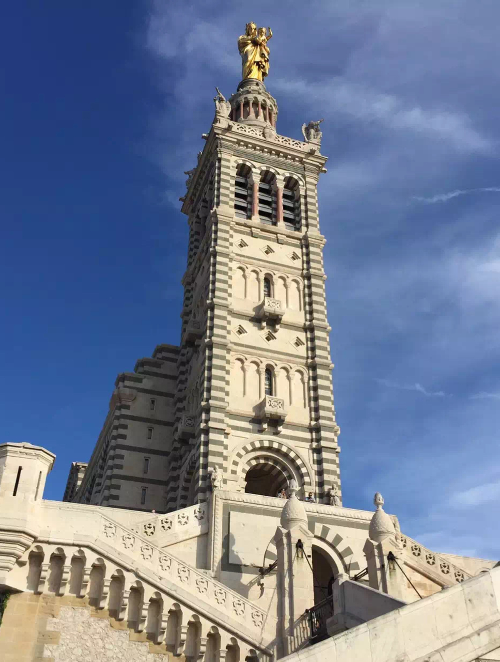 教堂主体建筑上方有一座金色的高达9.7米的镀金圣母像,据说,几乎在马赛的任何角度都可看到这尊闪闪发光的圣母像,教堂也因此成为马赛的标志。李仁奇 摄