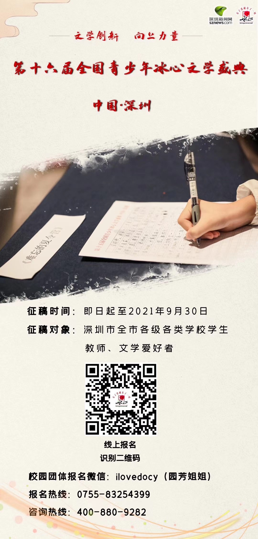 见圳客户端·深圳新闻网2021年3月15日讯 为继承和发扬中华文化及冰心文学精神,促进中华文化、中国现代化文学史更深入地植入深圳下一代青少年心中,2021年“第十六届全国青少年冰心文学盛典中国·深圳”正在爱好文学的师生学友们之间热烈展开。
