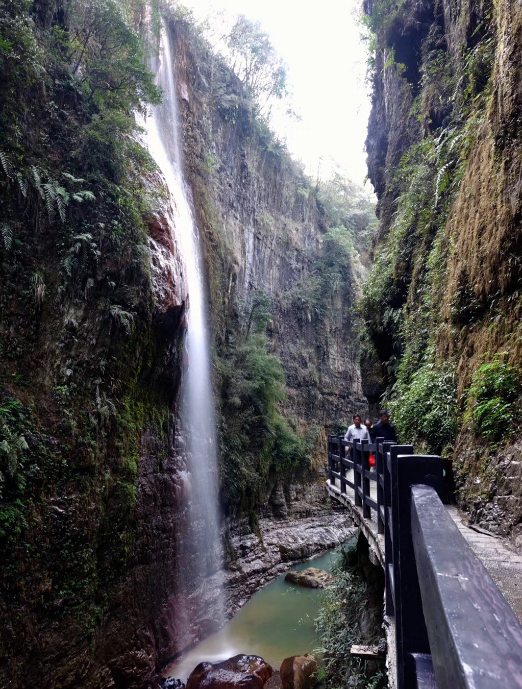 五彩黄龙瀑布,高60余米,顺一似教堂大钟状的紫铜色钙华体飞流直下,故称为金钟瀑布。李仁奇 摄