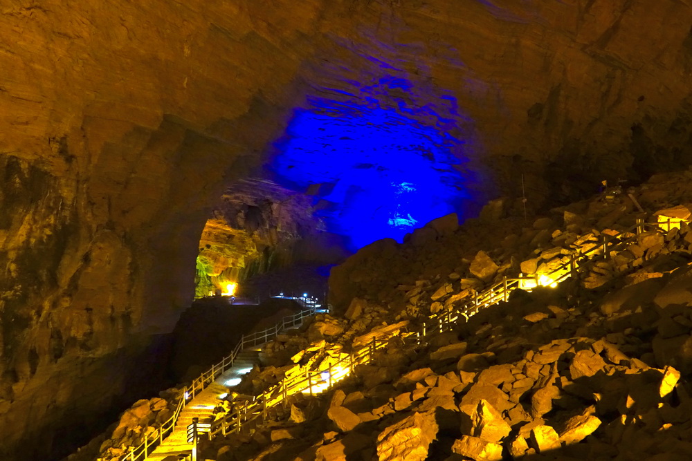 旱洞里现在有两个剧场,有定时的激光和歌舞表演。水洞里有地下瀑布10余处。李仁奇 摄