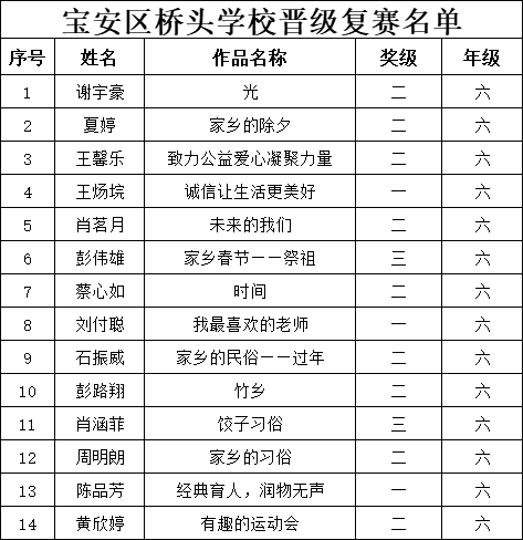 自2021年1月,活动征稿启动以来,获得了深圳市广大中小学生、教师、文学爱好者的热烈响应积极参与,吸引了深圳百余所学校的上万人关注报名。现公布宝安区桥头学校晋级复赛名单如下: