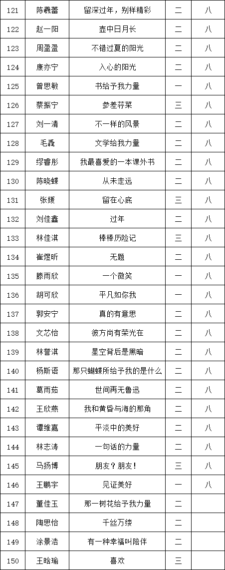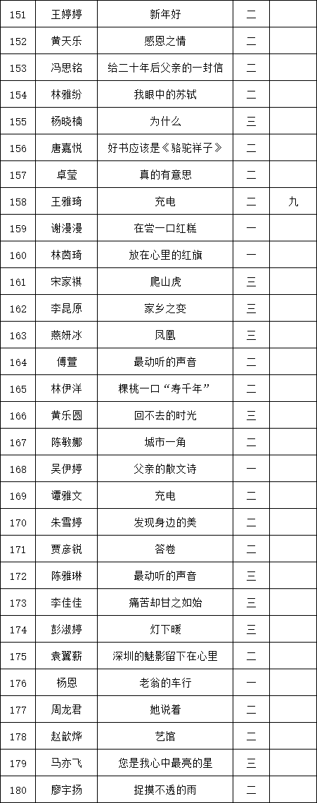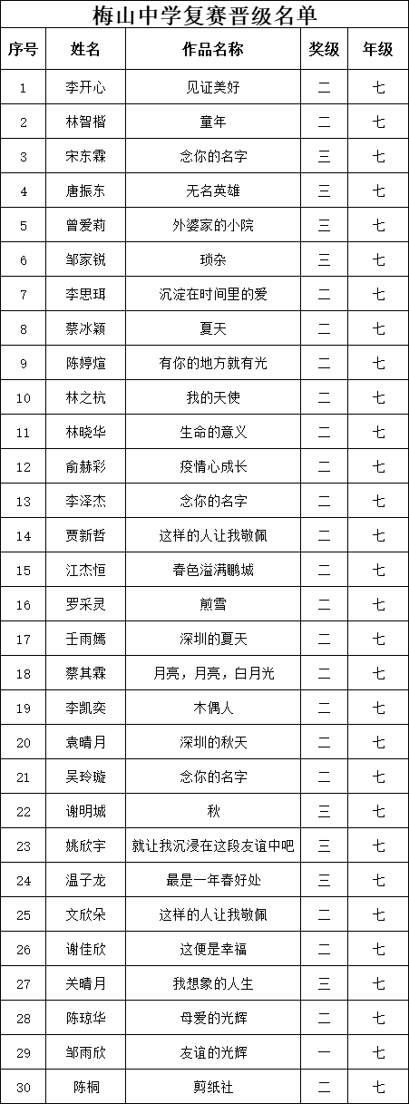 自2021年1月,活动征稿启动以来,获得了深圳市广大中小学生、教师、文学爱好者的热烈响应积极参与,吸引了深圳百余所学校的上万人关注报名。现公布福田区梅山中学晋级复赛名单如下: