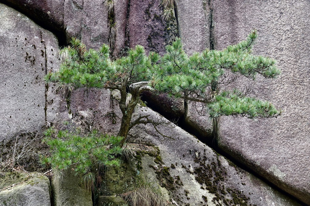 生长在岩石峭壁缝隙的松树,枝干苍劲,郁郁葱葱。李仁奇 摄