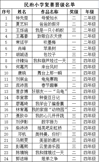 自2021年1月,活动征稿启动以来,获得了深圳市广大中小学生、教师、文学爱好者的热烈响应积极参与,吸引了深圳百余所学校的上万人关注报名。现公布龙华区民治小学晋级复赛名单如下: