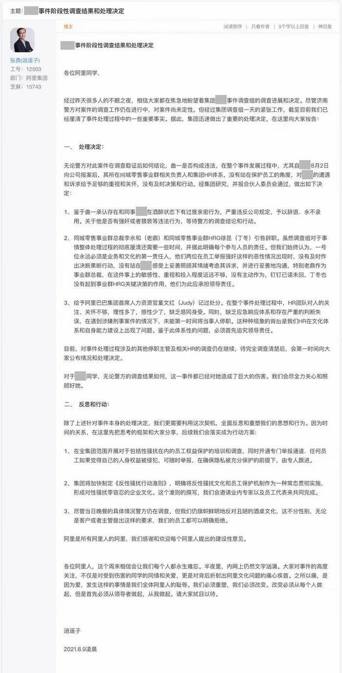 8月9日凌晨,阿里巴巴董事会主席兼CEO张勇在阿里内网公布了“女员工被侵犯”的阶段性内部调查结果和处理决定。