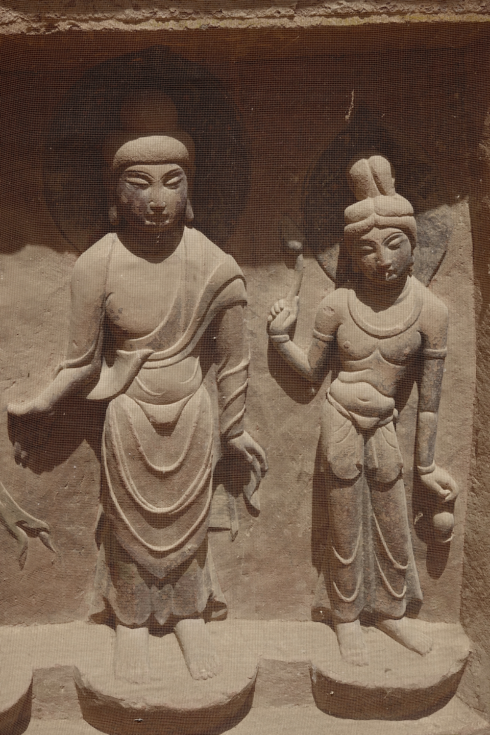 82窟,一结跏趺坐佛二胁侍菩萨,佛左右壁画二弟子。窟顶和门道露出底层,为北周原作,表层壁画为明代重绘。李仁奇 摄