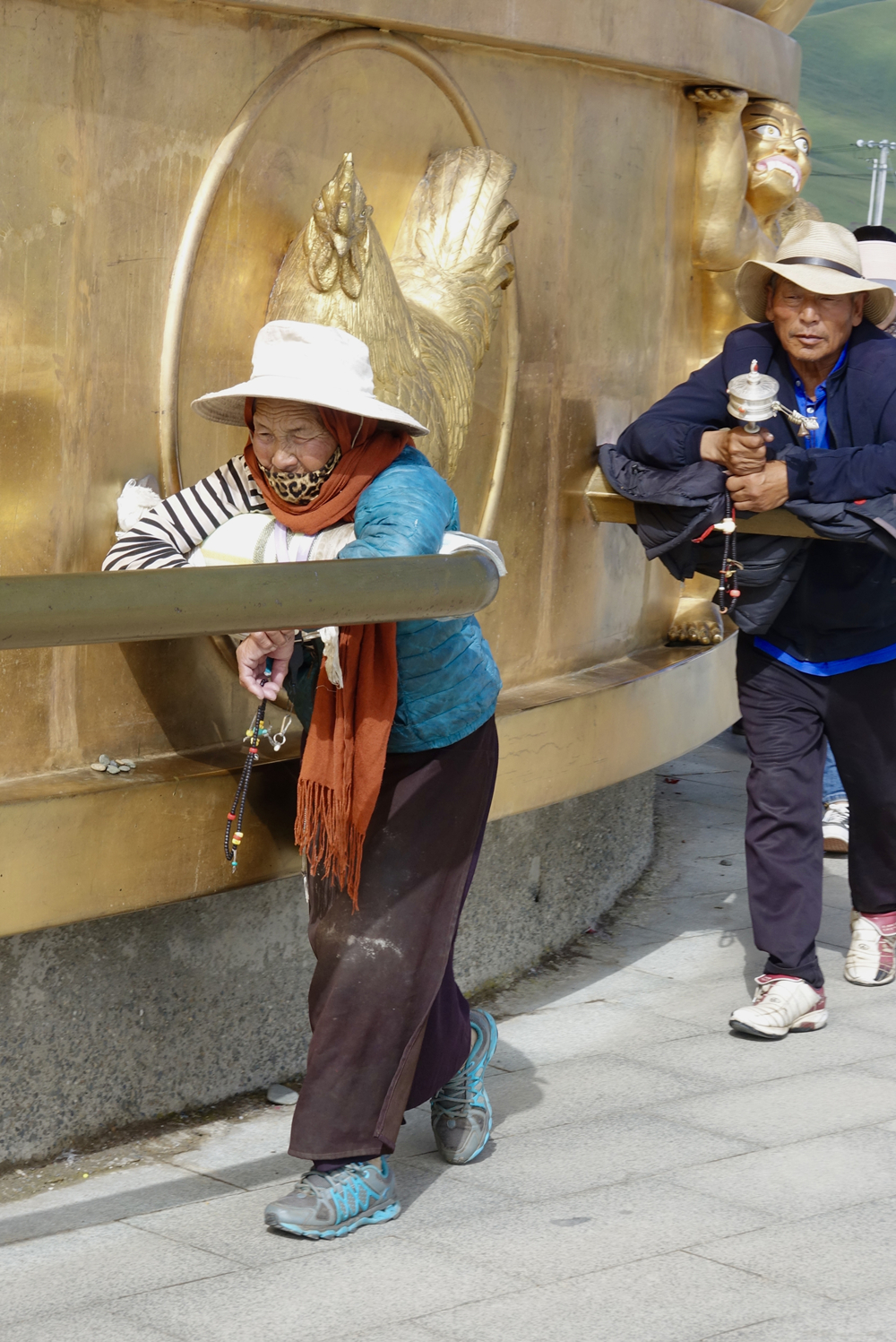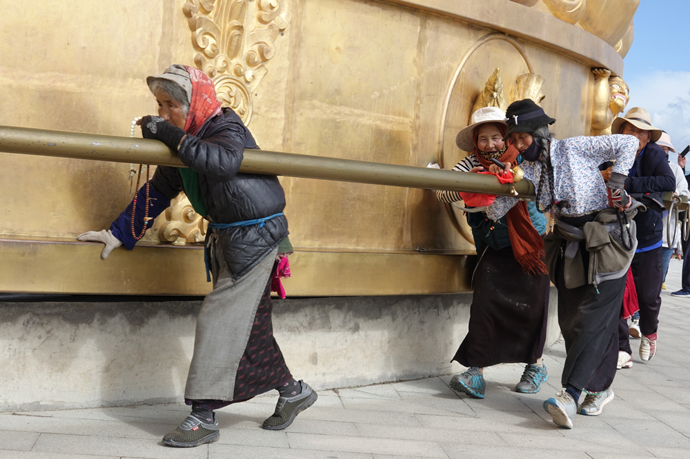 按照藏传佛教的说法,大转经筒上面刻的经咒和里面装的经咒比小转经筒要多,转一圈划过的轨迹比小转经筒大得多,积累的功德也高得多。李仁奇 摄
