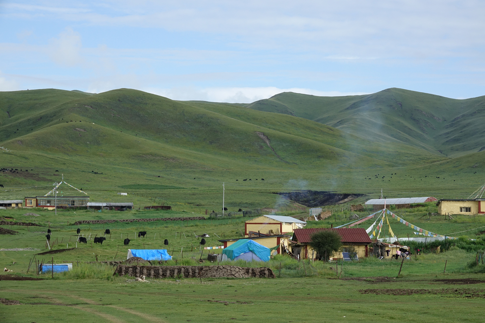 宁玛寺矗立在辽阔的扎西贡色草滩之上,四周被河流环绕。李仁奇 摄