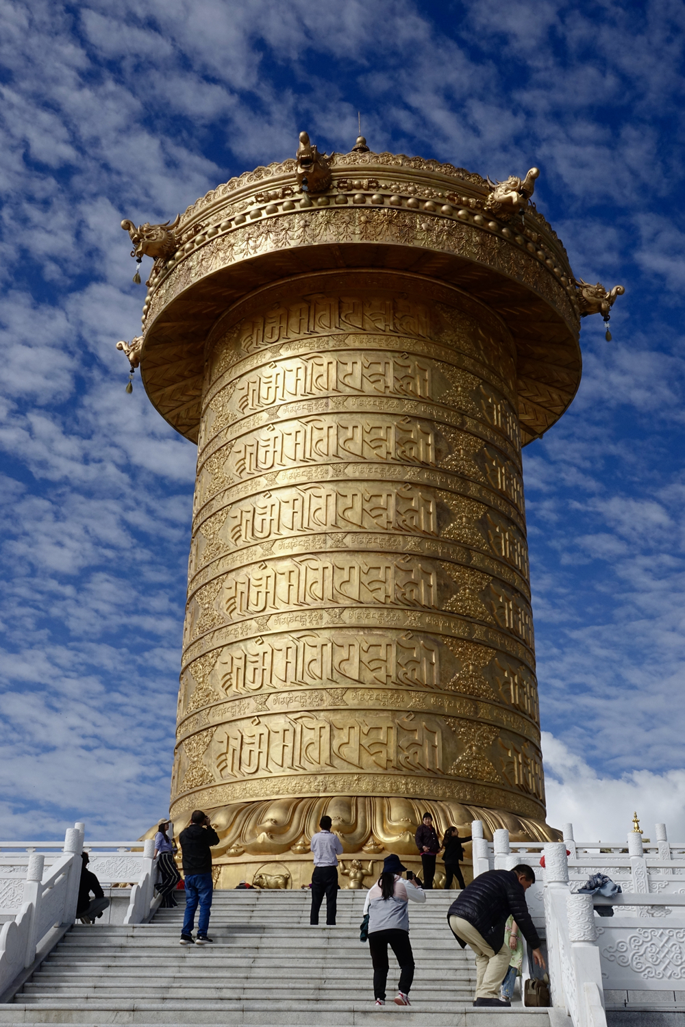 甘肃甘南藏族自治州玛曲县的宁玛寺大藏经转经筒矗立在金碧辉煌的寺院建筑群里,总投资4500万元,历经四年,于2018年建成。筒体浮雕由尼泊尔工匠使用60公斤黄金手工锻铸鎏金而成。转经筒自身重量达320吨,内装大藏经1008部共11万册。李仁奇 摄