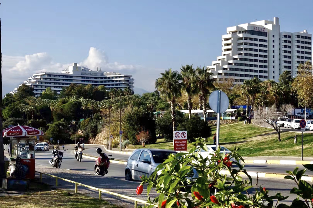 安塔利亚被群山环绕,成行的棕榈树构成一条条林荫大道,西面是一望无际的拉拉沙滩,南濒清澈的地中海,北临郁郁丛丛的托罗斯山脉。市区人口约60万,每年夏季有大量游客,特别是俄罗斯人涌入。李仁奇 摄