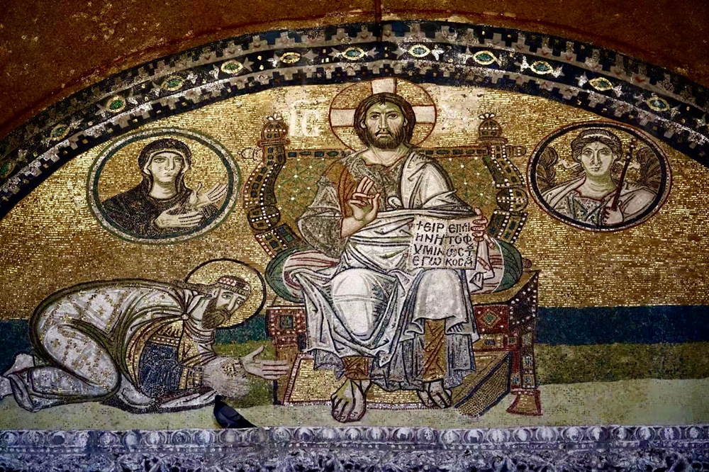 镶嵌画《全能的耶稣》。坐在宝座上的耶稣左手握着福音书,上面用希腊文写着:“赐予汝和平,我世界之光”。耶稣左边是圣母玛利亚,右边是大天使,当时的罗马皇帝虔诚的匍匐在耶稣面前。李仁奇 摄