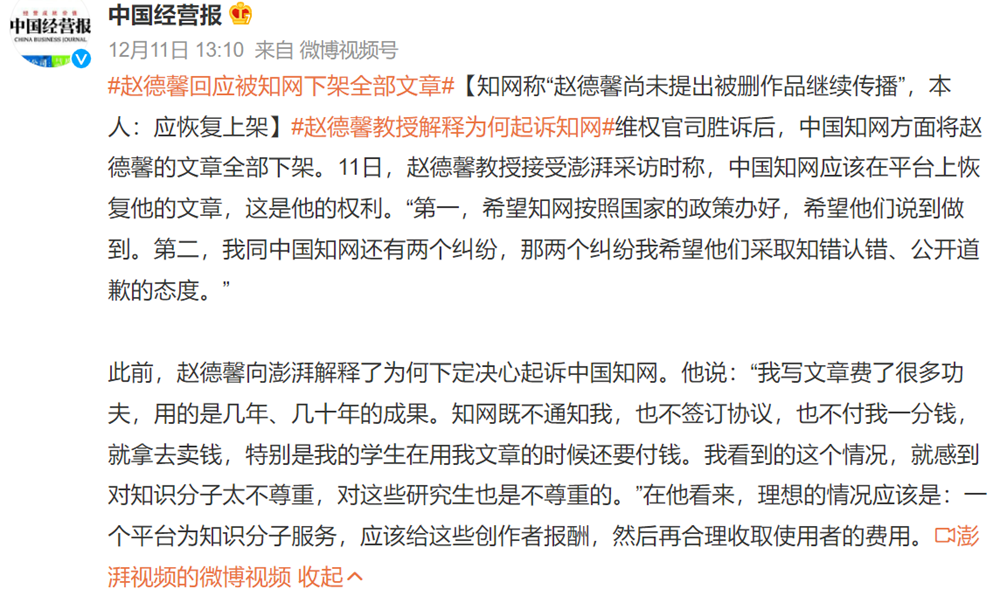 法学教授胜诉后论文被下架 赵德鑫:中国知网必须改革