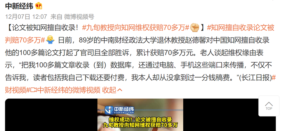 10.【法治事件】89岁退休法学教授赵德馨,从中国知网那里讨回了自己160多篇稿件70多万元元的收入,成为目前已知第一个向中国知网维权成功的胜诉案例。