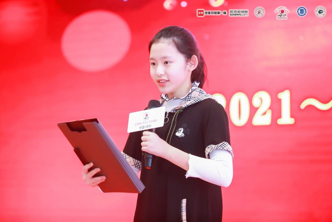 《中华文化现行倡导者》和《中华文化文学特长生人才库》代表:荔园小学通新岭校区李睿颐带来原创诗朗诵《如果我能穿越六维空间就能展现边陲小镇——深圳的历史变迁》
