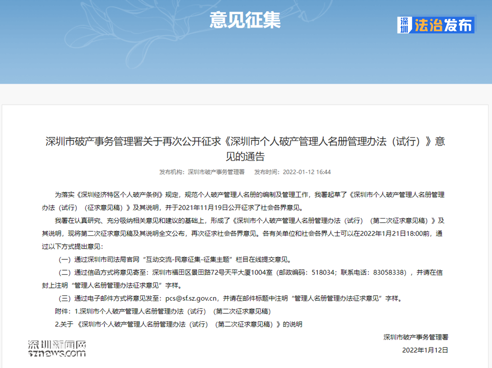 读特客户端•深圳新闻网2022年1月18日讯(记者 张玲)日前,深圳市破产事务管理署在深圳市司法局发布通告,面向社会征集《深圳市个人破产管理人名册管理办法(试行)》(以下简称管理办法)的意见,有意提交者可在2022年1月21日18时前提交。