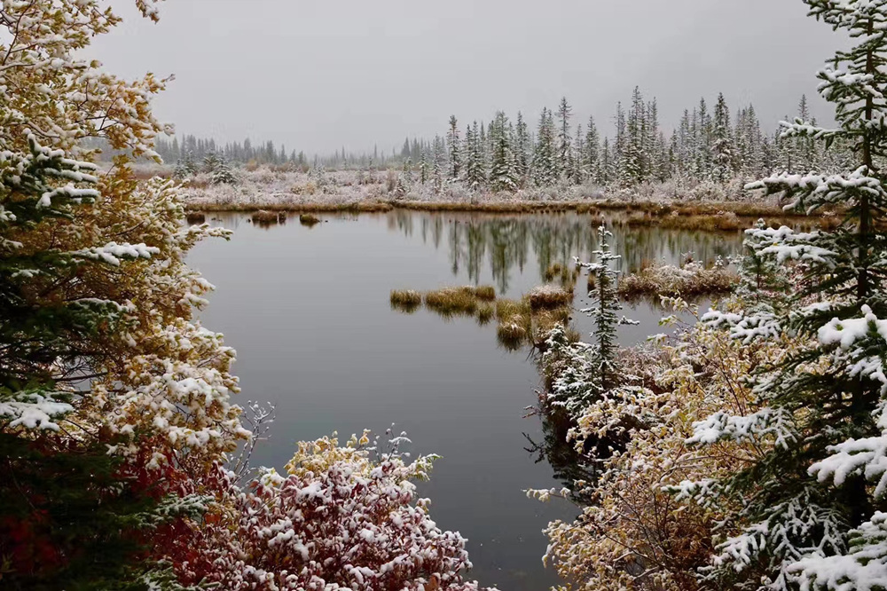 秋季是班夫最美的季节,像九寨沟一样,在蓝色湖泊、绿色丛林之外,又多出了红色和黄色的树叶,映衬在白色的雪山之中,呈现出一个五彩缤纷的世界。李仁奇 摄
