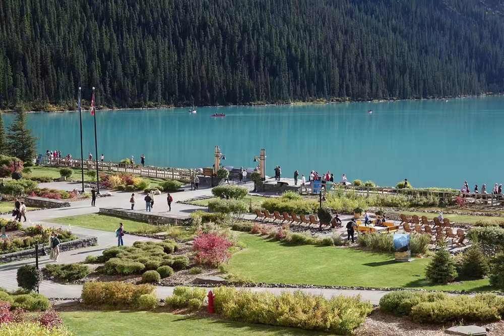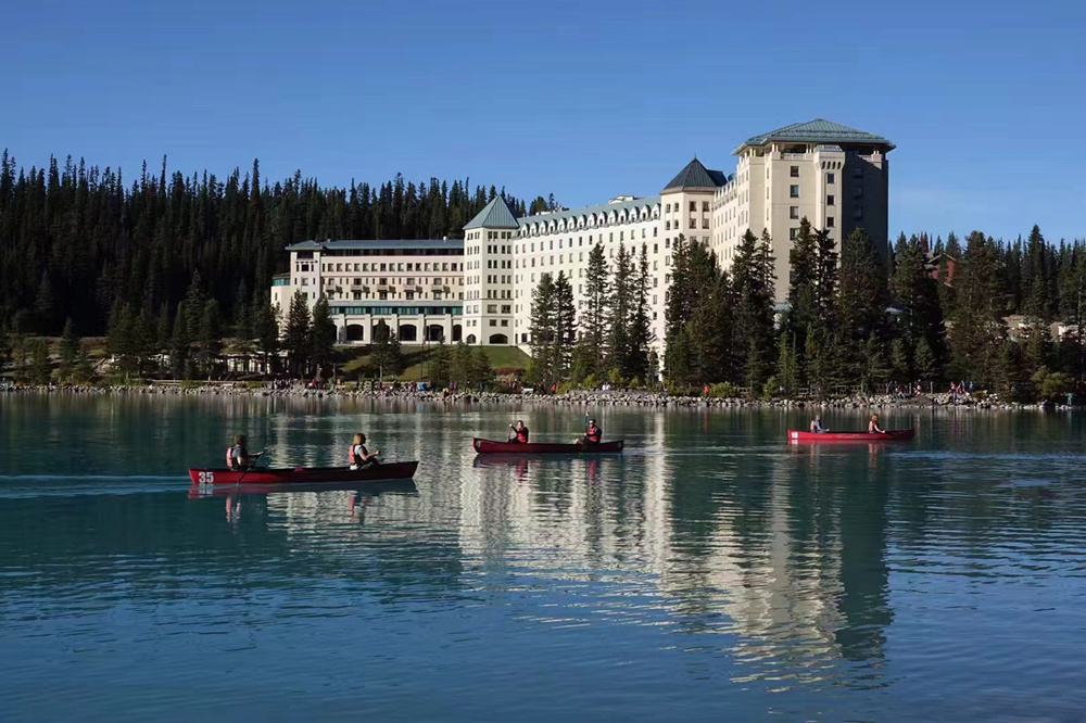 露易斯湖源自维多利亚冰川,湖水碧绿清澈,远望就像镶嵌在落基山脉中的一颗翡翠。李仁奇 摄