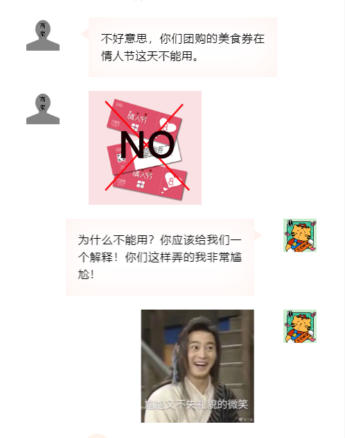 遇到春节、情人节等特殊时期,消费者在团购时应当看清使用期限,如商家未提前说明美食券的限用日期,而是去到现场才告知消费者不能使用,则商家涉嫌侵害消费者的知情权、公平交易权。如商家销售美食券的页面,注明情人节不能使用,此时商家尽到了提醒义务,消费者可在规定的其他时间内使用美食券,或者向平台申请退款。(消费提示:消费者购买团购券时,要仔细阅读团购页面的使用说明,特别是要仔细浏览团购券使用时限。限用人数等具体内容,避免遭遇买了却用不了的困境。)