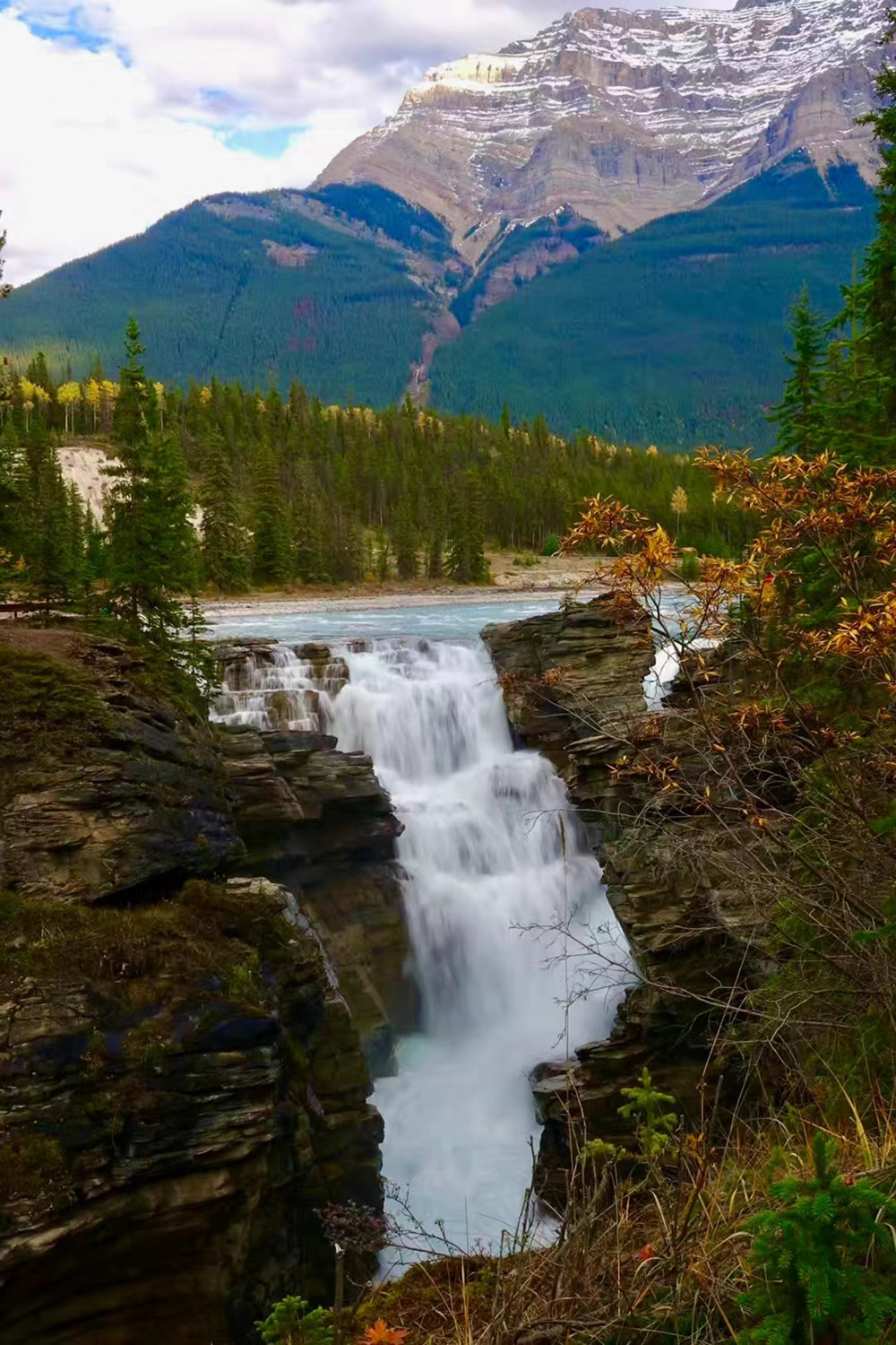 哥伦比亚冰原的融水汇成了阿萨巴斯卡河,由南向北至贾斯珀附近跌落至二三十米的断崖,形成了这万马奔腾般的阿萨巴斯卡瀑布。李仁奇 摄
