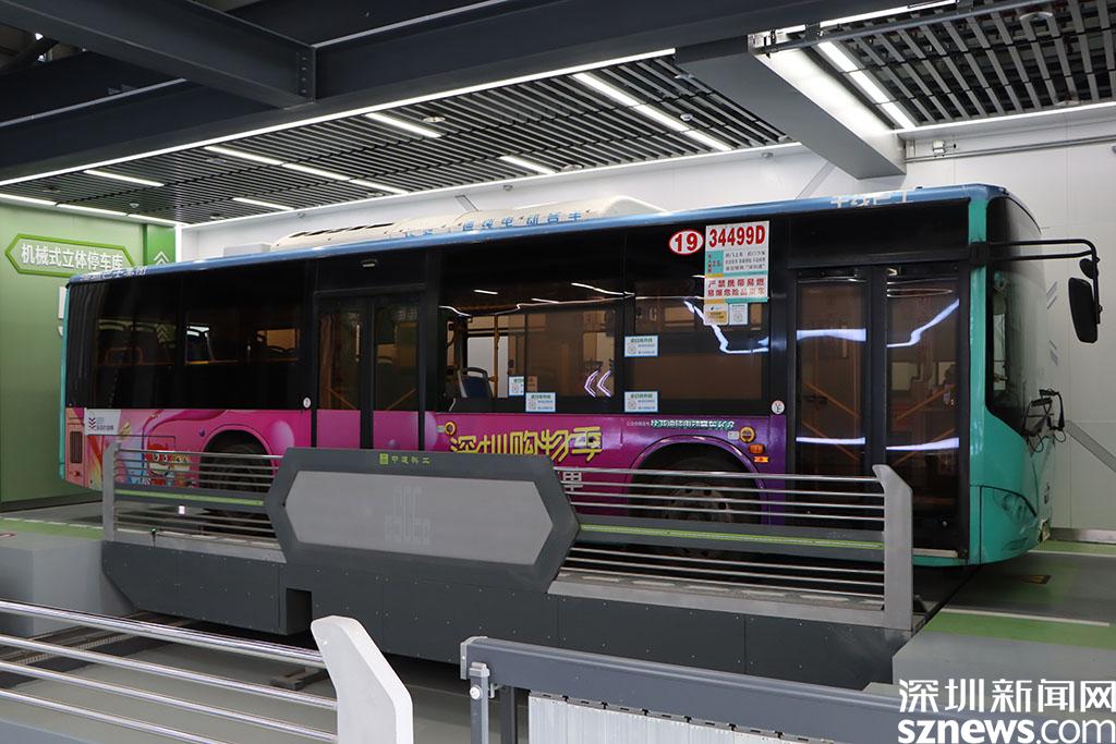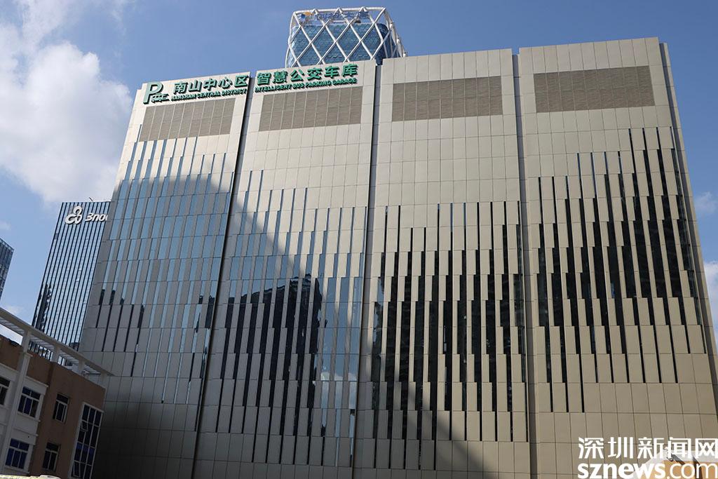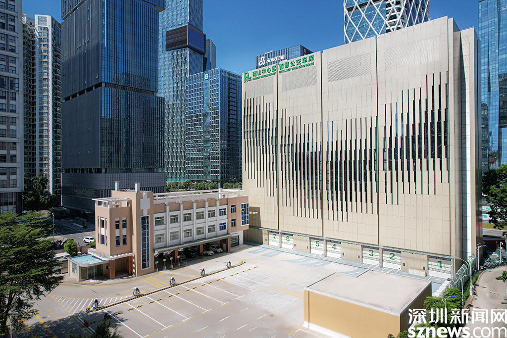 立体公交车库位于南山区粤海街道文心五路的南山中心区公交场站内,原有31个地面车位,为12条公交线路提供服务。改造后的公交场站车库变身为4组9层升降类立体公交车库,建筑高度45.7米,设置有7个出入口,停车位增加到85个,其中地面充电车位17个、立体车库内车位68个,并相应预留68个公交车充电接口。