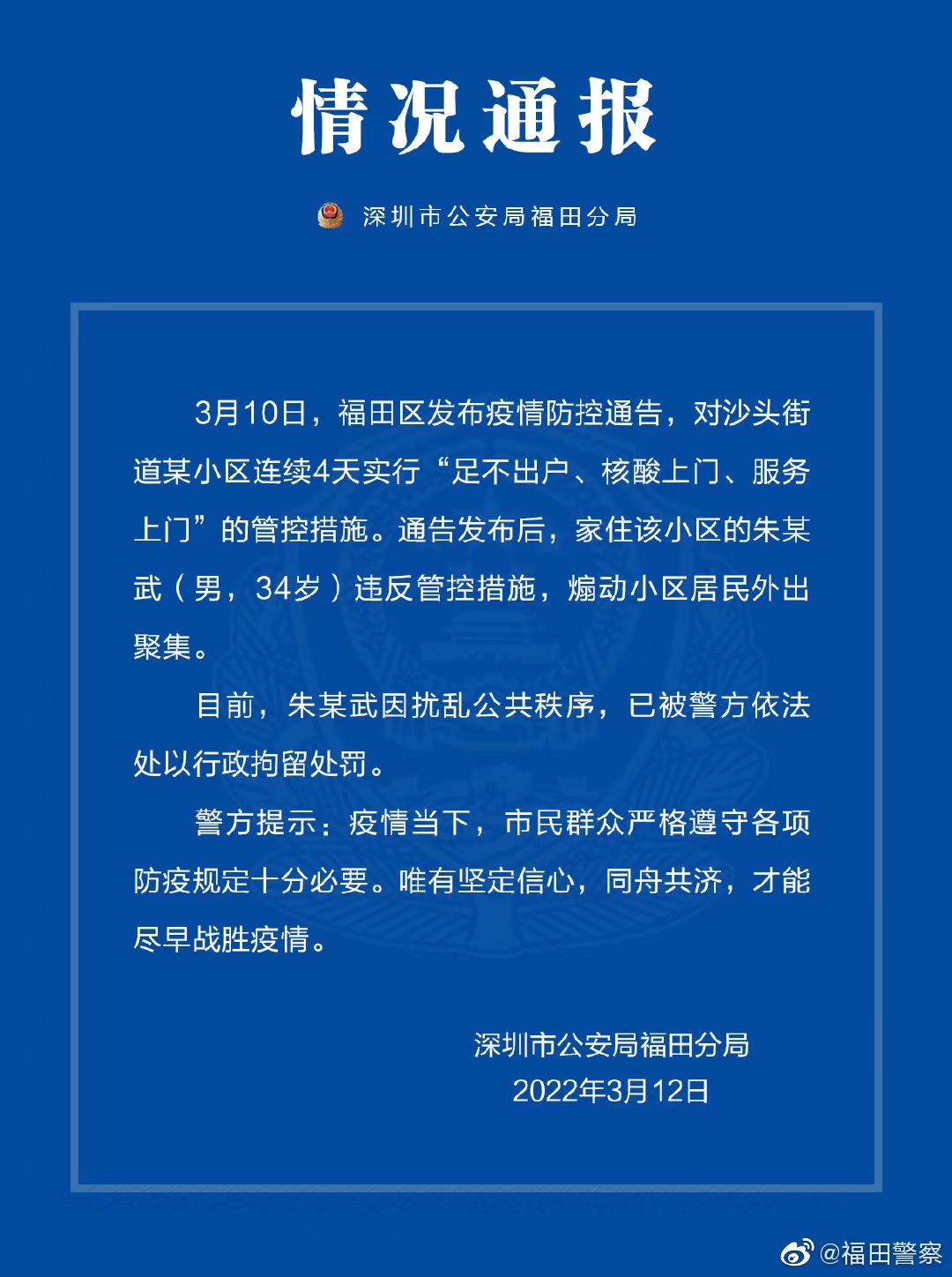 读特客户端•深圳新闻网2022年3月12日讯(记者 林恒鑫)3月12日,深圳市公安局福田分局通报:3月10日,福田区发布疫情防控通告,对沙头街道某小区连续4天实行“足不出户、核酸上门、服务上门”的管控措施。通告发布后,家住该小区的朱某武(男,34岁)违反管控措施,煽动小区居民外出聚集。目前,朱某武因扰乱公共秩序,已被警方依法处以行政拘留处罚。