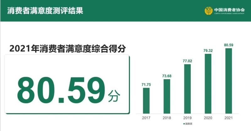 测评结果显示,2021年度100个城市消费者满意度综合得分为80.59分,较2020年提高1.27分,且首次突破80分。