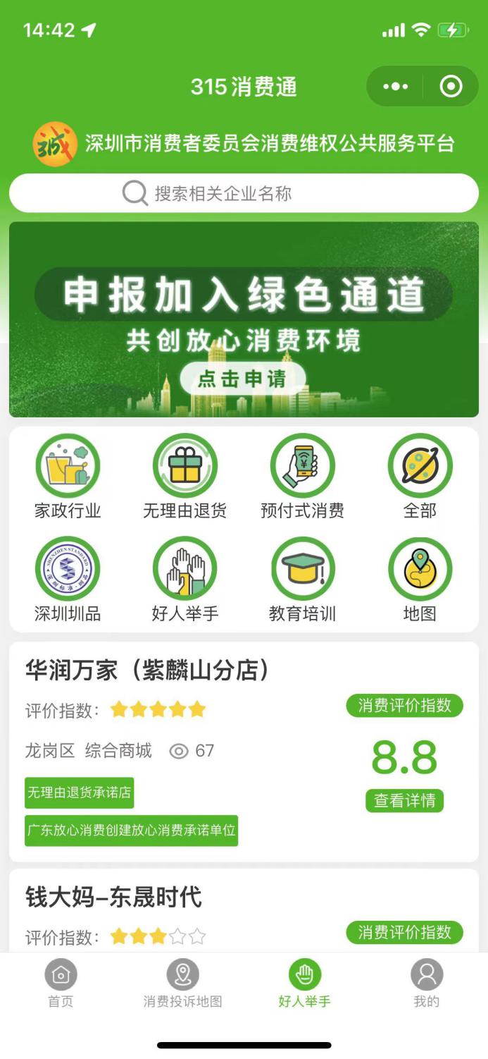 深圳消委会“315消费通”小程序“好人举手”-“无理由退货”栏目