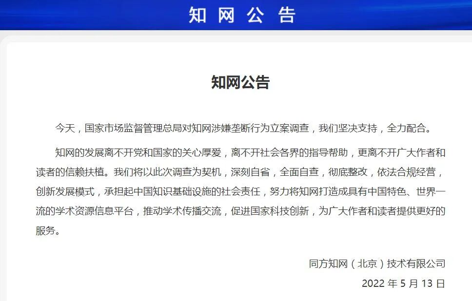 今天,国家市场监督管理总局对知网涉嫌垄断行为立案调查,我们坚决支持,全力配合。